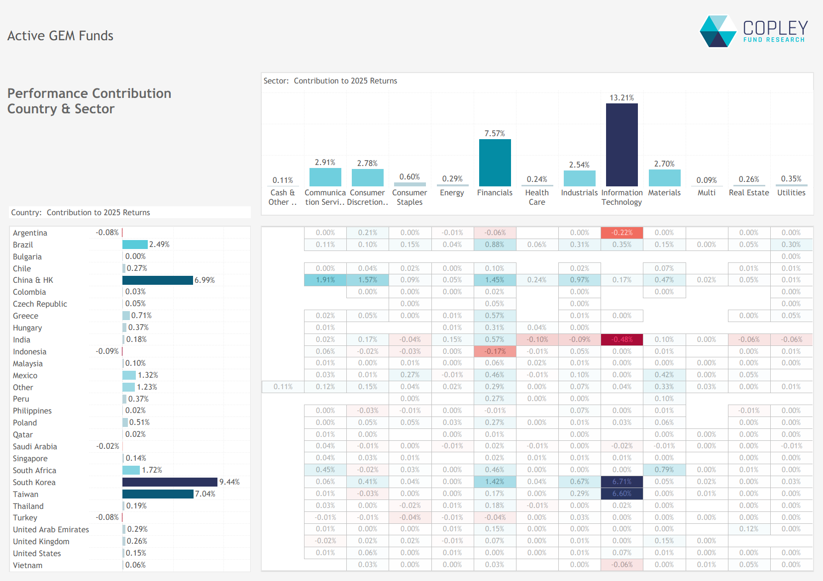 The charts below break down the components of the 32% average return for active GEM funds in 2025, using a portfolio based on managers’ aggregate holdings. At the sector level, Technology was by far the largest contributor, adding 13.2% to returns. Financials followed at 7.6%, with Communication Services, Consumer Discretionary, Industrials, and Materials each contributing between 2.5% and 3%.