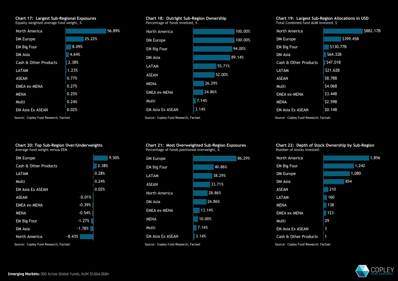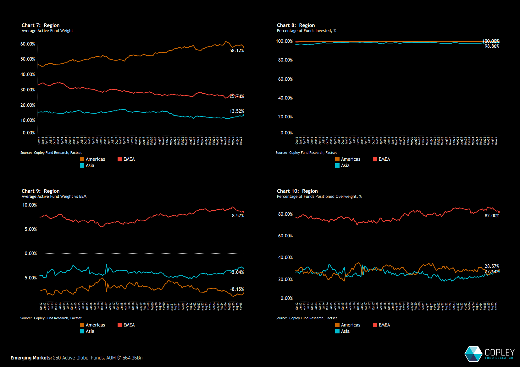 Europe continues to command structural active backing, with 82% of funds overweight despite flat absolute allocations. At the sub-regional level, global portfolios remain a two-horse race: North America and DM Europe account for over 80% of total capital, while EM exposure remains concentrated in the “Big Four.”