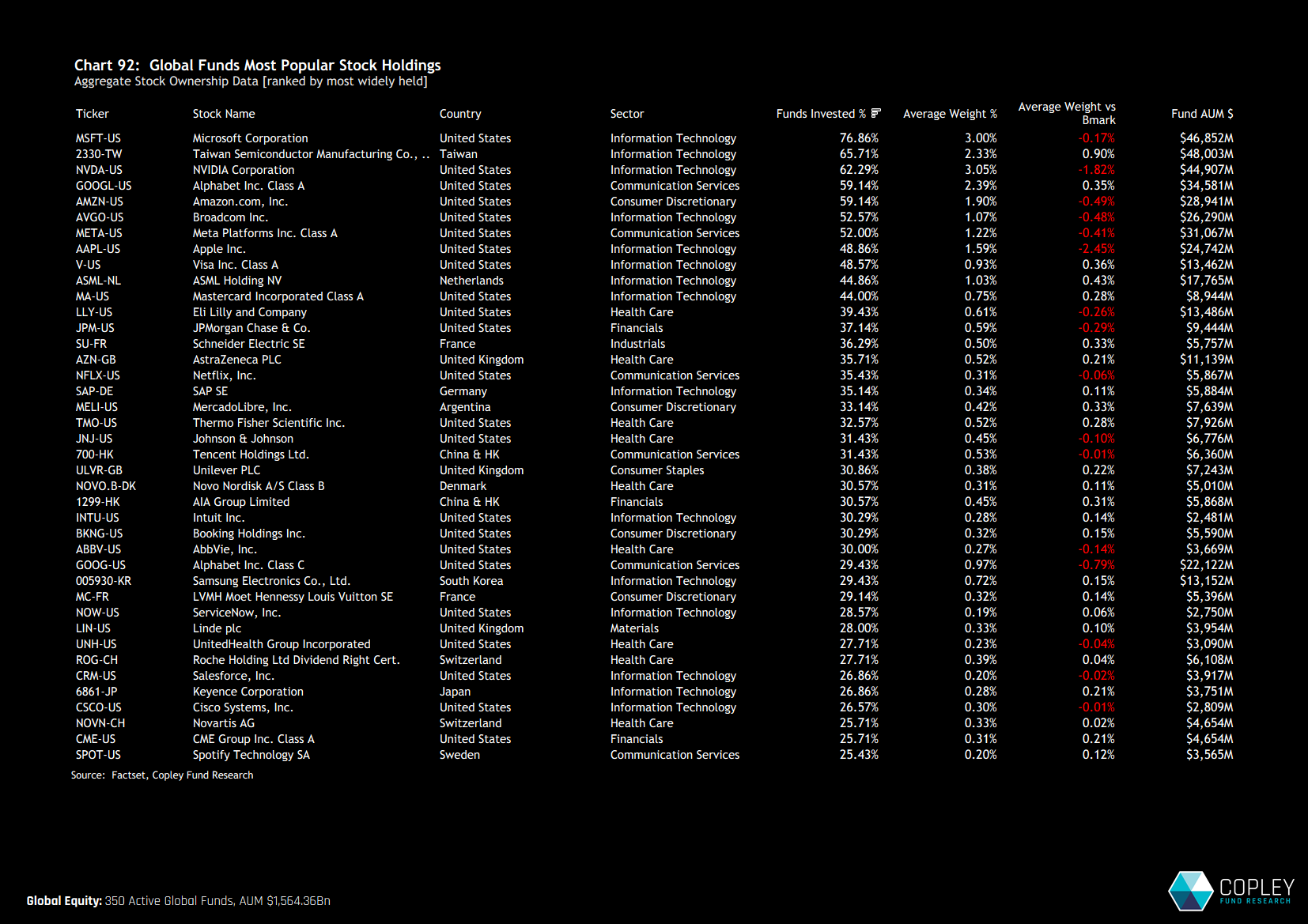 Technology continues to dominate, accounting for 8 of the 11 most widely held stocks across global active portfolios. Microsoft remains by far the most widely owned, appearing in 77% of funds, with an average weight of 3% — broadly in line with the benchmark. TSMC is held by slightly more funds than NVIDIA, although NVIDIA carries the highest average weight globally at 3.05%.