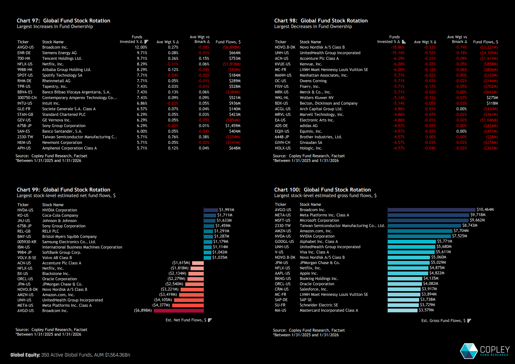 Regionally, flows reinforce this concentration. Broadcom, Siemens Energy and Tencent lead ownership gains, while legacy defensive and healthcare names — including Novo Nordisk and UnitedHealth — have seen sharp reductions. Across regions, capital is consolidating into a narrower set of perceived structural winners.