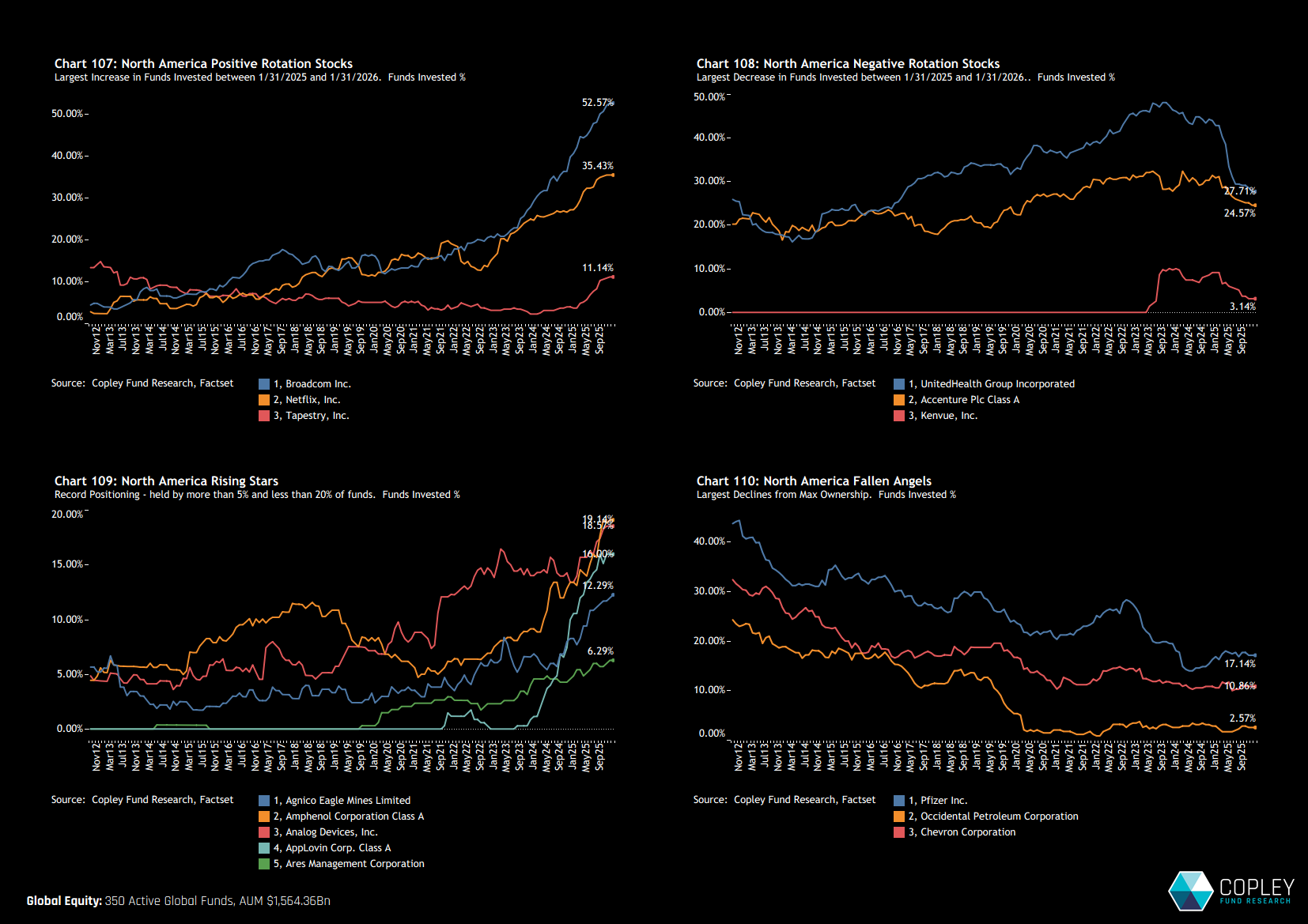 Across North America we highlight 14 stocks driving the positioning narrative. Chart 107 shows the three largest ownership increases in 2025, with Broadcom, Netflix and Tapestry ending the month at all-time highs. Chart 108 captures the most significant reductions. Chart 109 flags emerging names pushing toward the top of their historical ownership ranges but still held by fewer than 20% of managers, with AppLovin and Amphenol standing out for particularly strong investment growth.