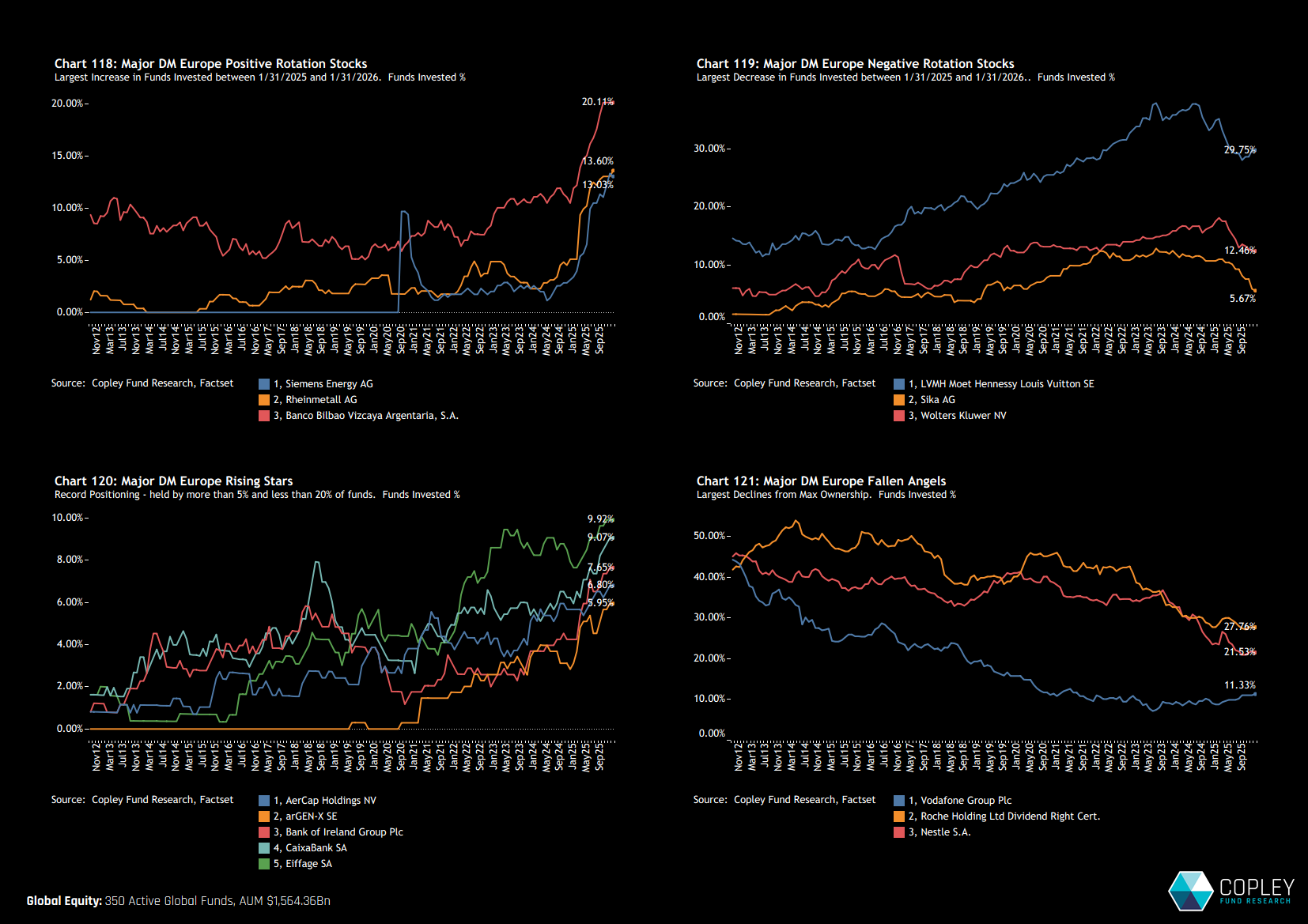 In Europe, positioning is becoming more polarised. Siemens, Rheinmetall and BBVA have surged to record ownership levels, while LVMH, Sika and Wolters Kluwer have seen meaningful investor exits (Charts 118–119).