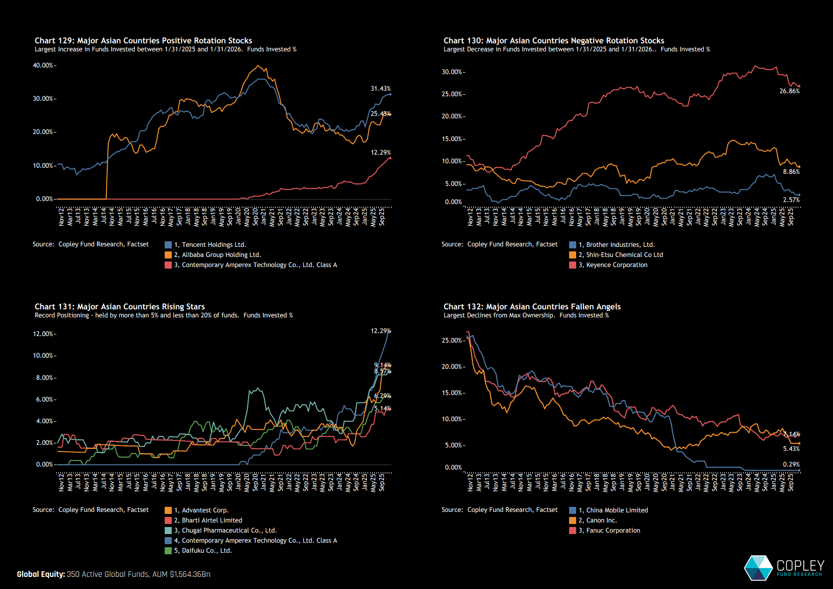Emerging interest is building in names such as Advantest, Chugai Pharmaceutical and Daifuku, while exposure to China Mobile, Canon and Fanuc continues to erode, with ownership in each trending toward negligible levels.