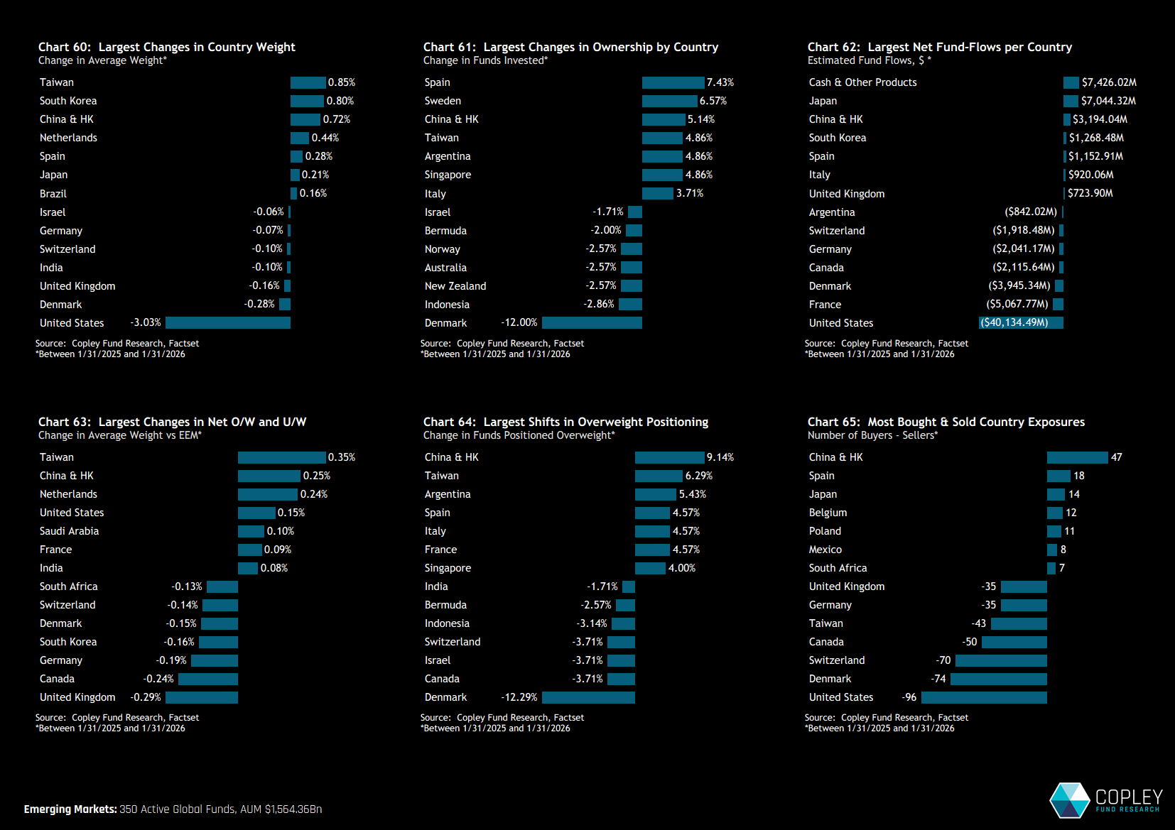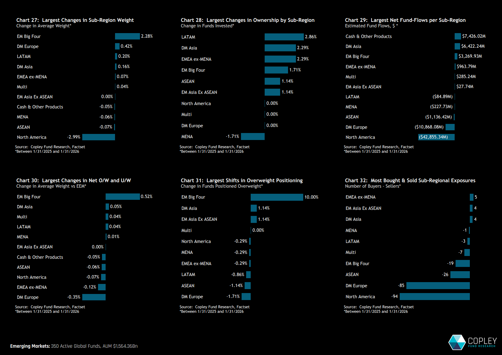 Aggregate positioning shifted meaningfully over the past 12 months. Chart 27 highlights changes in average weights between 01/31/2025 and 01/31/2026, showing a clear rotation in exposure from North America toward EM’s Big Four. While price action has inevitably contributed, the active component of this move is evident.