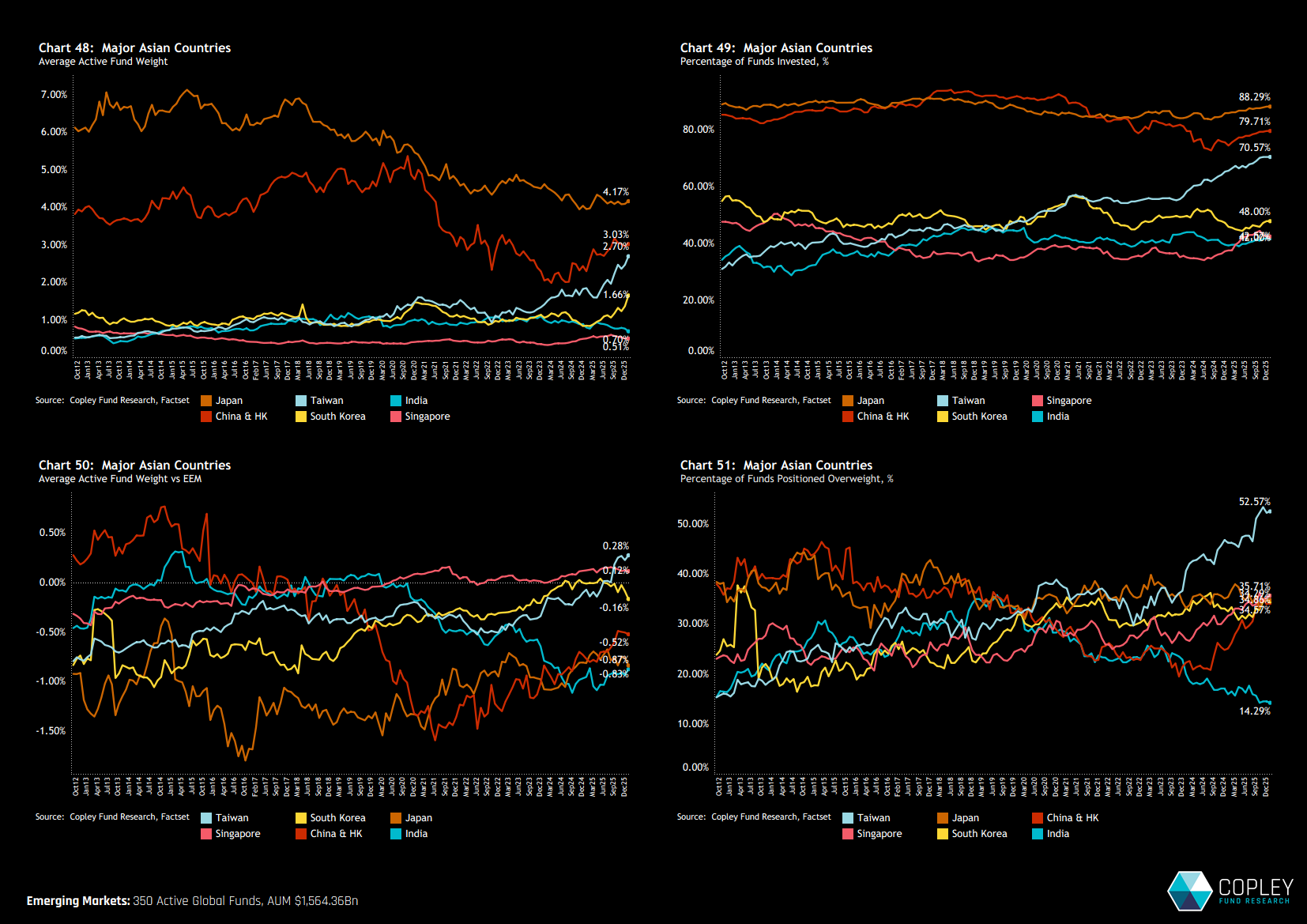 Breaking this down further, global fund exposure remains a two-horse race, with North America and Developed Market Europe accounting for 82.1% of total allocations. Within Emerging Markets, the “big four” — China, South Korea, Taiwan and India — dominate positioning, each with average weights of 8.1%.