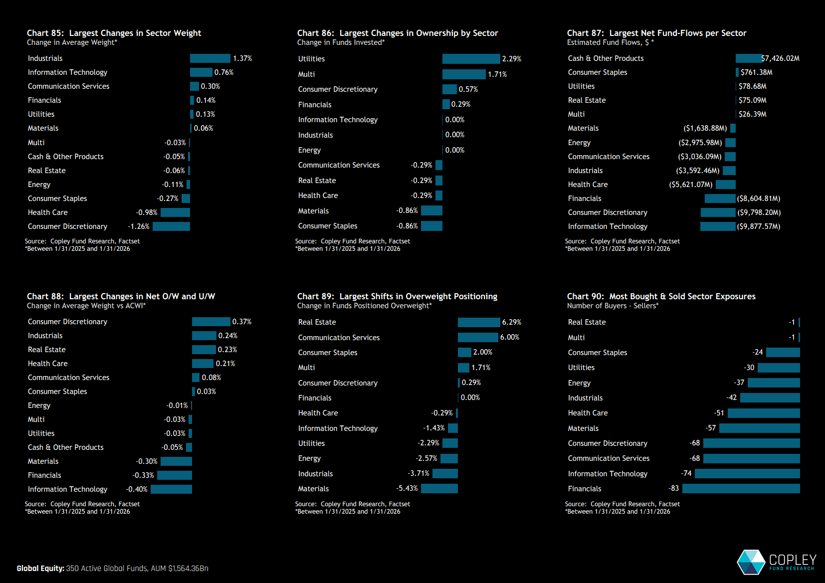Sector exposures among Global strategies shifted modestly over the past 12 months, with no moves large enough to materially alter overall positioning. Industrials recorded the largest net increase in average weight, alongside Technology, while reductions were concentrated in Consumer Discretionary and Health Care.