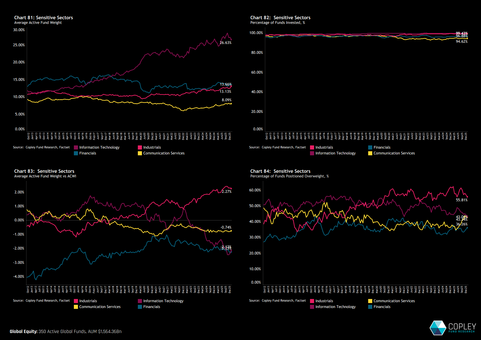 Entering 2026, global active portfolios are characterised by persistent US underweights, renewed but selective engagement with Asia’s largest economies, record exposure to Industrials, and increasingly concentrated conviction in mega-cap technology leaders.