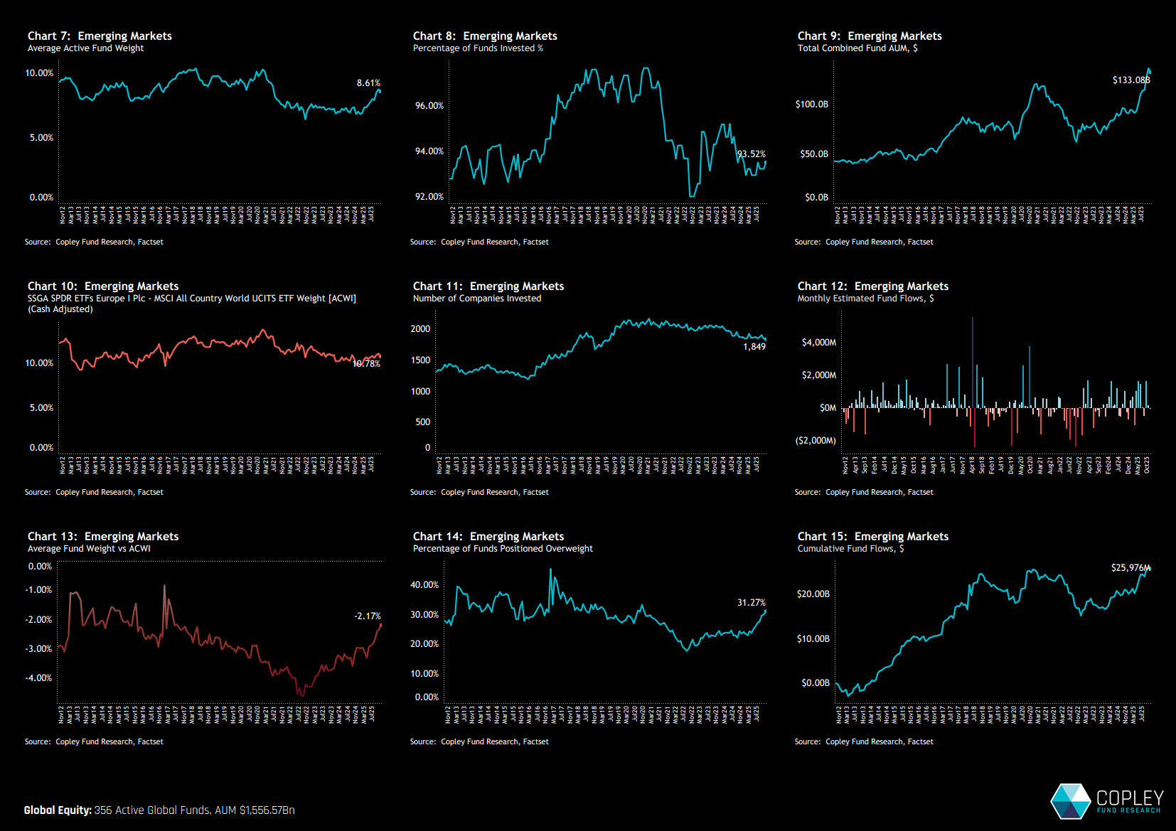 After years of range-bound allocations, Emerging Markets are finally gaining ground in Global portfolios. Average EM weights have broken out of a long-standing band, reaching their highest level since 2019, supported by strong inflows and a clear shift in positioning among active managers. The share of funds now overweight EM has risen meaningfully, and the net underweight has narrowed to its tightest level in eight years.