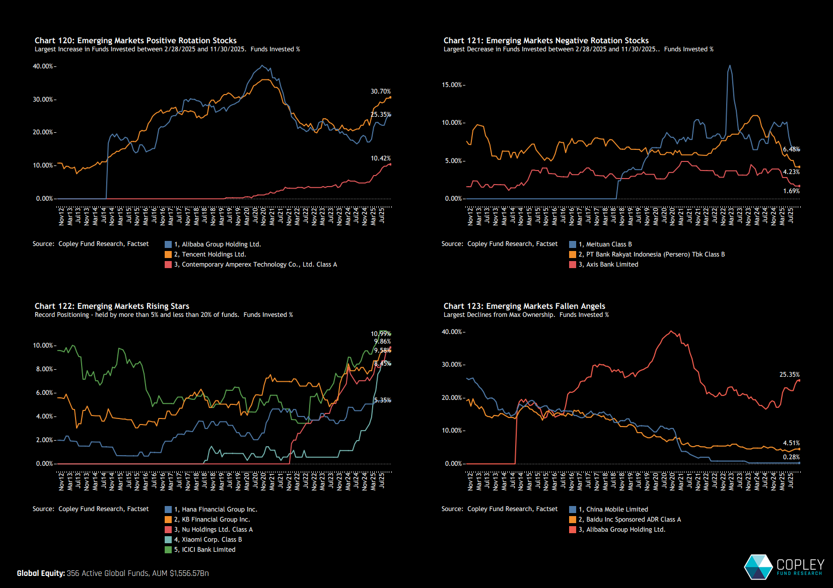 Chart 120 shows the time-series of funds invested in the three companies with the largest increase in ownership between February and November this year. It’s an all-China affair, with Tencent and Alibaba both regaining some of the ownership momentum lost during the 2020–2024 period, while Contemporary Amperex Technology (CATL) has pushed to new record highs — though it remains lightly held overall. Against this, Meituan, Axis Bank, and Bank Rakyat have seen recent declines in fund ownership (chart 121), while China Mobile, Alibaba Group Holding, and Baidu have recorded the steepest drops from previous highs (chart 123). Finally, chart 122 highlights five stocks now at record ownership levels but still held by fewer than 20% of managers — potential early-stage names that could attract broader interest as conviction builds.