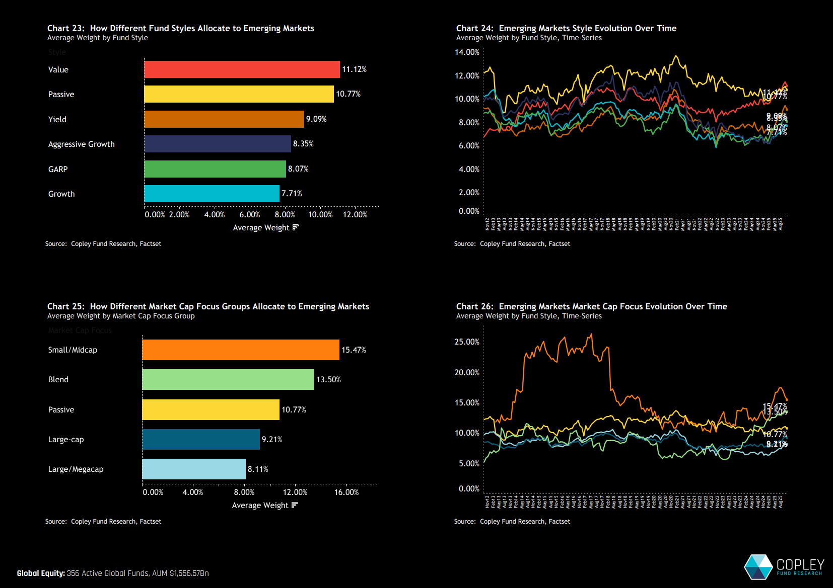 Finally, it’s worth examining how different types of Global funds are positioned in EM. Charts 23 and 24 break this down by fund style, and while EM is often linked to high-growth narratives, the data tells a different story. Value funds currently hold an average EM weight of 11.1%, compared to just 7.7% for Growth funds. A similar pattern emerges when looking at market cap focus: Small- and Mid-Cap-oriented funds are far more exposed to EM than their Large- or Mega-Cap counterparts (charts 25 and 26). While this partly reflects the limited presence of EM names in the global megacap universe, it also underscores the depth of opportunity that still exists among smaller companies across emerging markets.