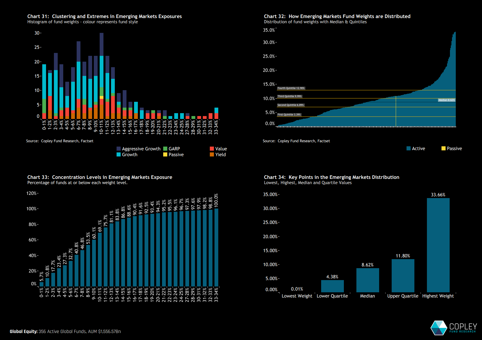 The EM allocation picture across individual Global funds is laid out in the four charts below. Chart 31 shows a clear clustering of fund weights between 0% and 13%, though there’s a long tail of higher-conviction positions extending well beyond that. Chart 33 confirms that 81% of funds are positioned below 13%, with the middle 50% of allocations falling between the quartile bands of 4.4% and 11.8% (chart 34). At the top end, the most bullish EM allocators hold as much as 33.7%, highlighting the wide dispersion of positioning across the fund universe.