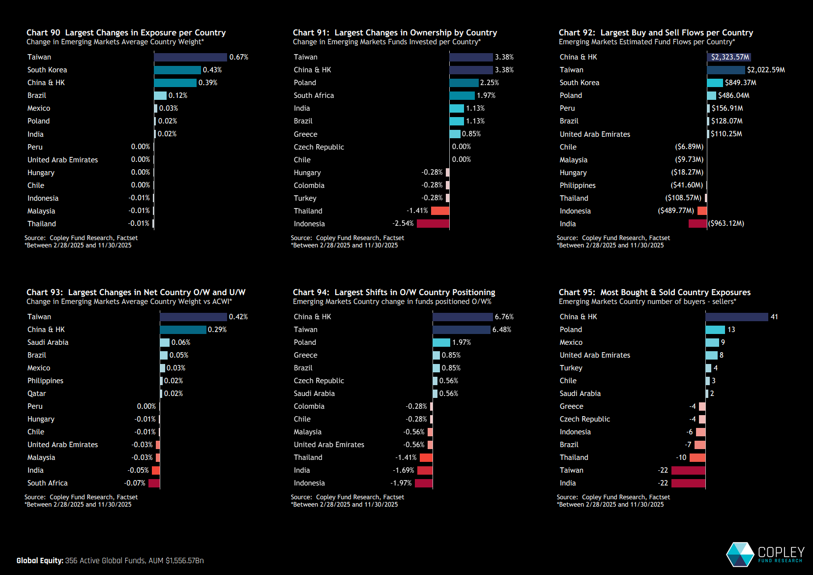 This move has been led by renewed interest in North Asia — particularly Taiwan, China & Hong Kong, and South Korea — with additional support from smaller markets like Poland and South Africa. At the stock level, TSMC remains the standout, but increased ownership in names like Tencent, Alibaba, and CATL hints at broader re-engagement with key EM equities.