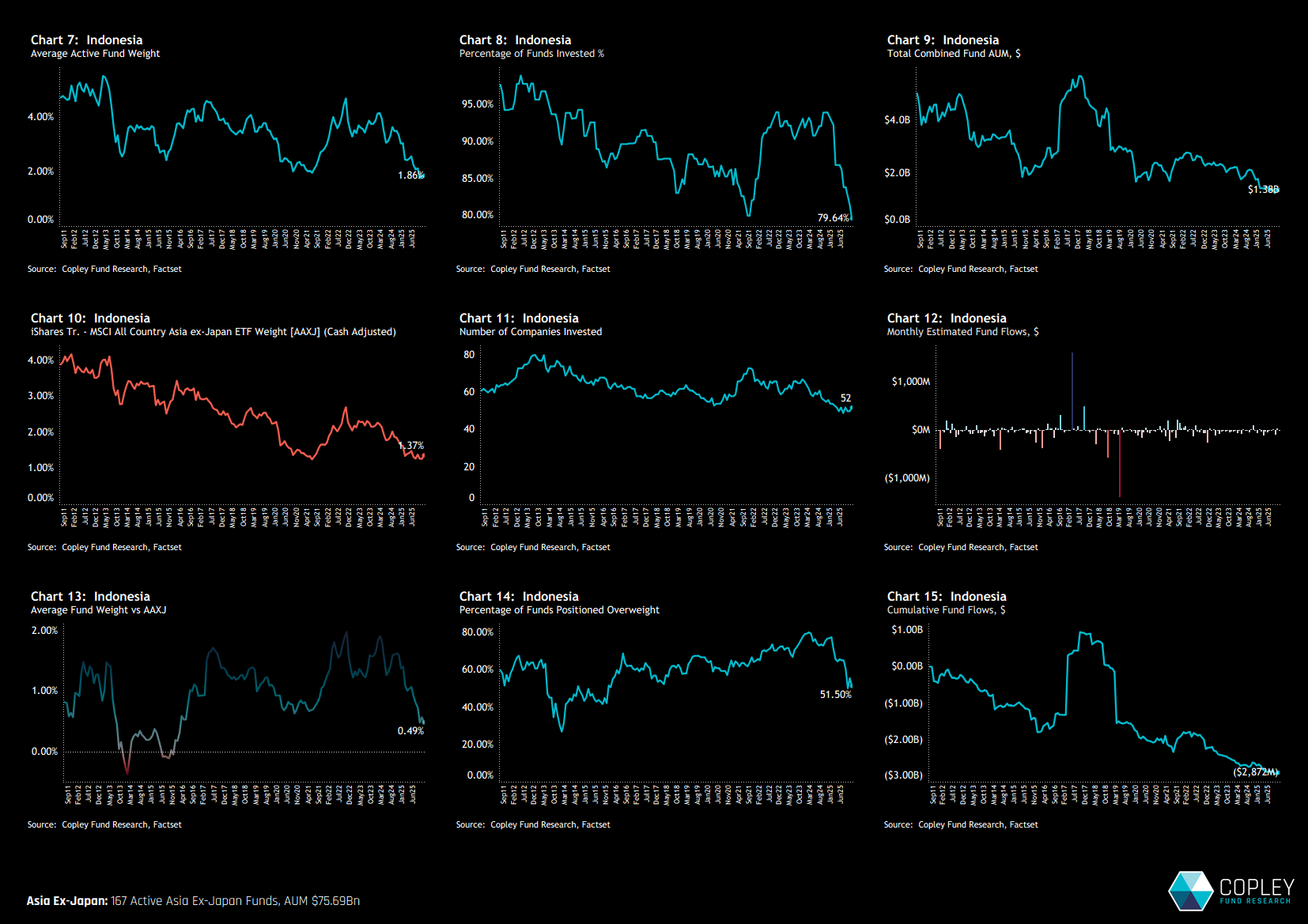 Over the past six months, 7.2% of funds have sold out entirely, and average weights have dropped sharply. Exposure is now concentrated in five stocks, which account for 75% of all Indonesia allocations—but ownership in these names has also fallen. The median weight sits well below the average, skewed by a handful of high-conviction holders.