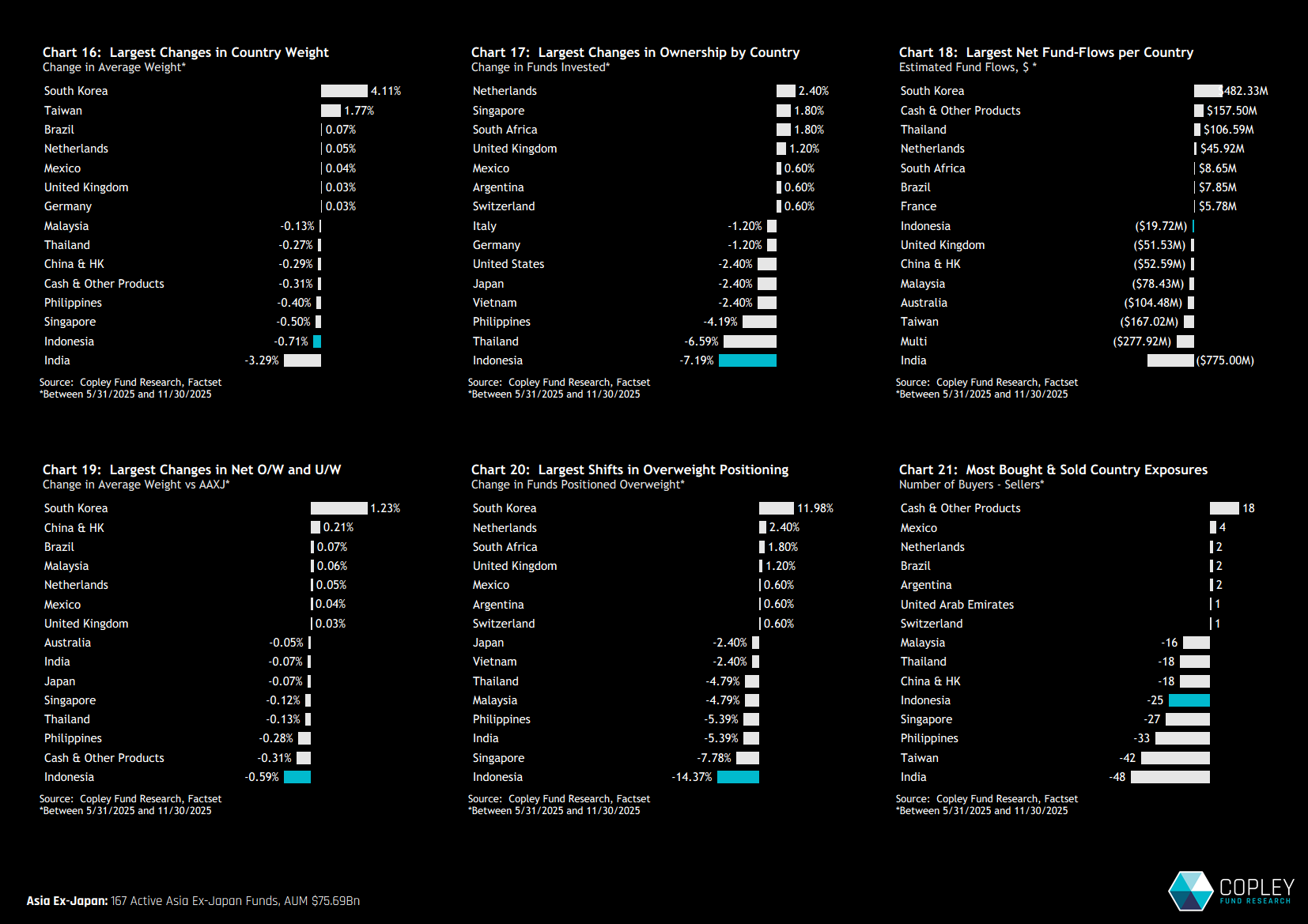 Over the past six months, Indonesia has experienced the sharpest decline in fund ownership across the Asia ex-Japan universe. Of the 167 active strategies tracked, 7.2% fully exited their Indonesia positions between May 31 and November 30, 2025 (chart 17). The average weight dropped by 0.71%, the second-largest decline after India (chart 16). Indonesia also saw the steepest reduction in both the percentage of funds positioned overweight and the aggregate net overweight (charts 19&20). These shifts were driven by persistent net outflows and a consistent tilt toward selling activity, highlighting a broad-based rotation out of the market. Beyond Indonesia, India, Thailand, and the Philippines also faced similar selling pressure. In contrast, South Korea emerged as the key beneficiary, attracting inflows and increased fund interest during the same period.