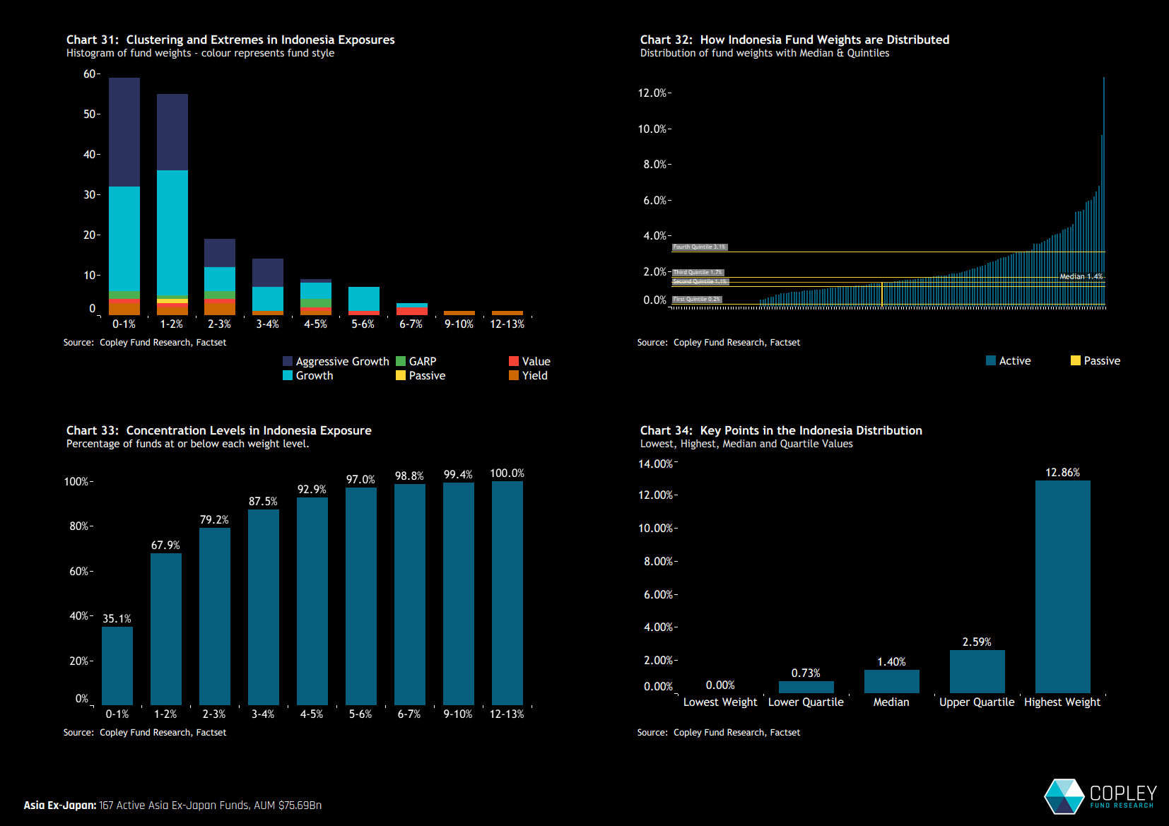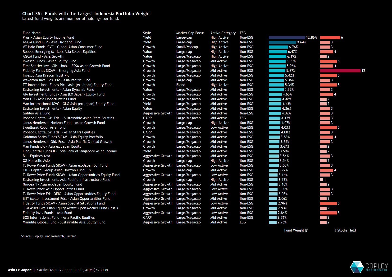 The extended right-hand tail in Indonesia fund exposure is driven by a handful of high-conviction positions. At the top of the distribution are two income-focused strategies – Prusik Equity Income and AGCM Asia Dividend – with Indonesia weights of 12.9% and 9.6%, respectively. Beyond these outliers, only 10 funds hold exposures above 5%. Most of these positions are narrowly focused, typically concentrated in just three to four stocks.