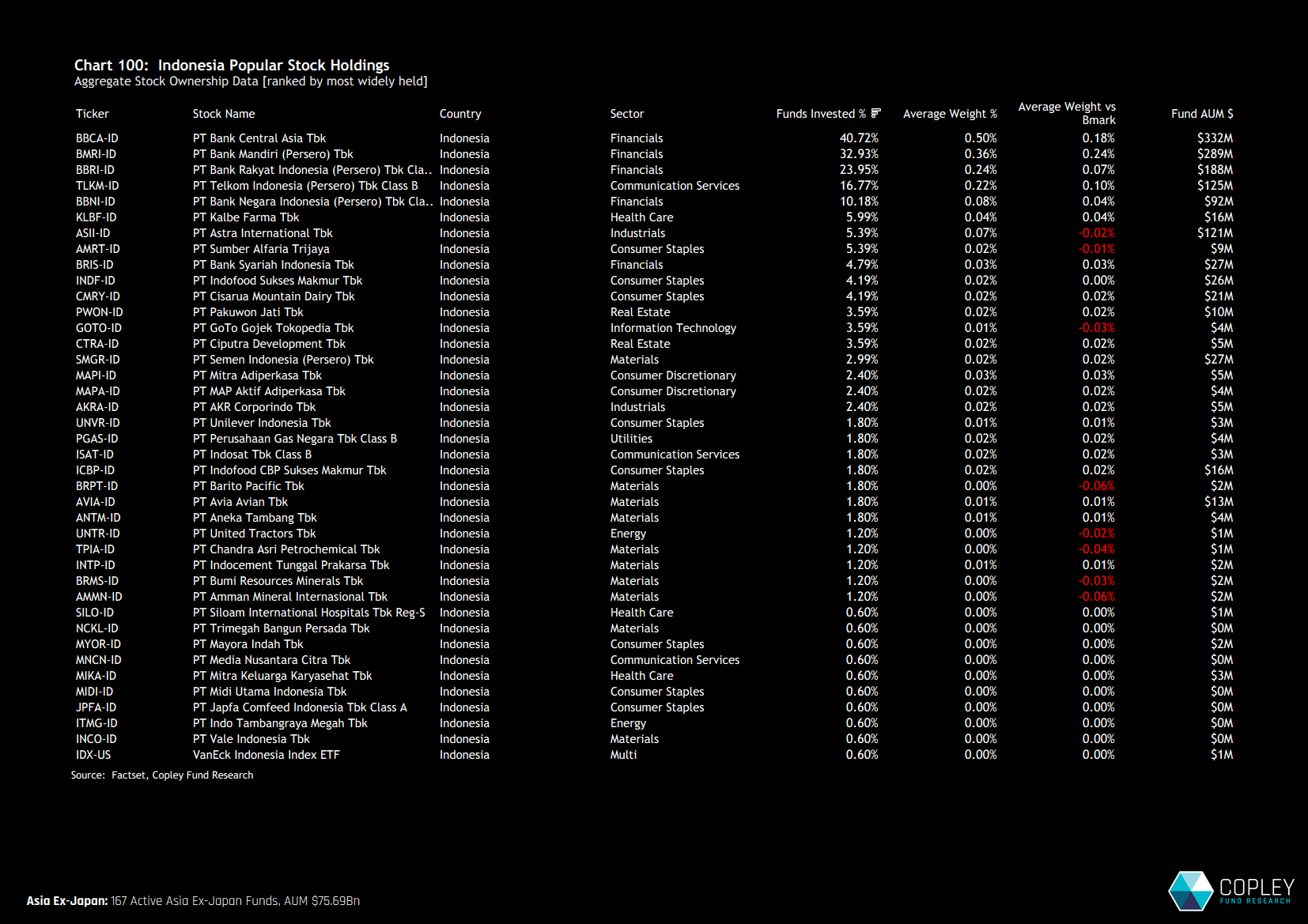 Please click on the link opposite for the full positioning report on Indonesia. It contains 133 charts, including fund-level detail at the country/sector, industry and stock level, breakdowns by Style, Market Cap Focus and Benchmark Independence, together with a full gap analysis on past holders and potential buyers in the country.