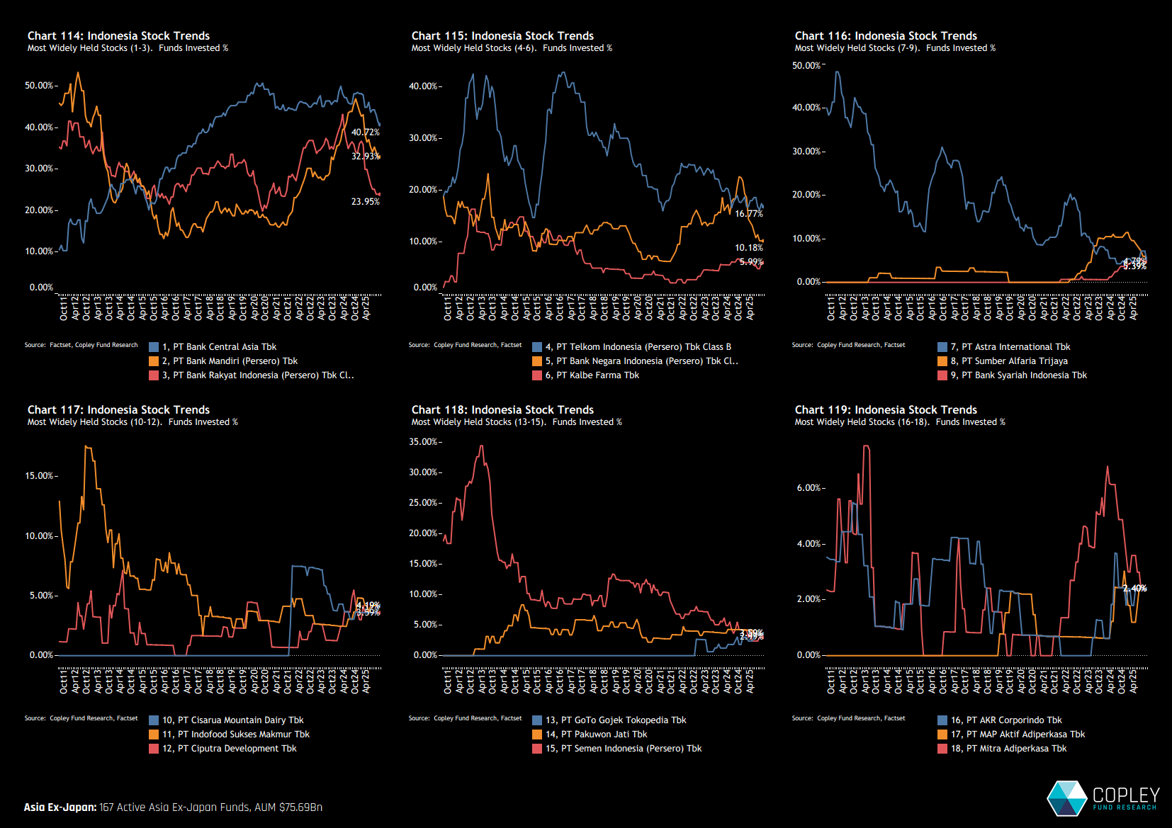The chart set below tracks the evolution of fund ownership in the 18 most widely held Indonesian stocks. Charts 114 and 115 highlight where the bulk of the recent exodus has taken place—particularly among the top five names. Bank Central Asia, Bank Mandiri, Bank Rakyat, Telkom Indonesia, and Bank Negara have all seen steep drops in fund ownership from their peaks at the end of 2024. This weakness extends beyond the top names. Longer-term declines are evident in other once prominent stocks such as PT Astra International and PT Semen Indonesia. Overall, there are few signs of renewed interest or positive activity at the stock level in recent months.
