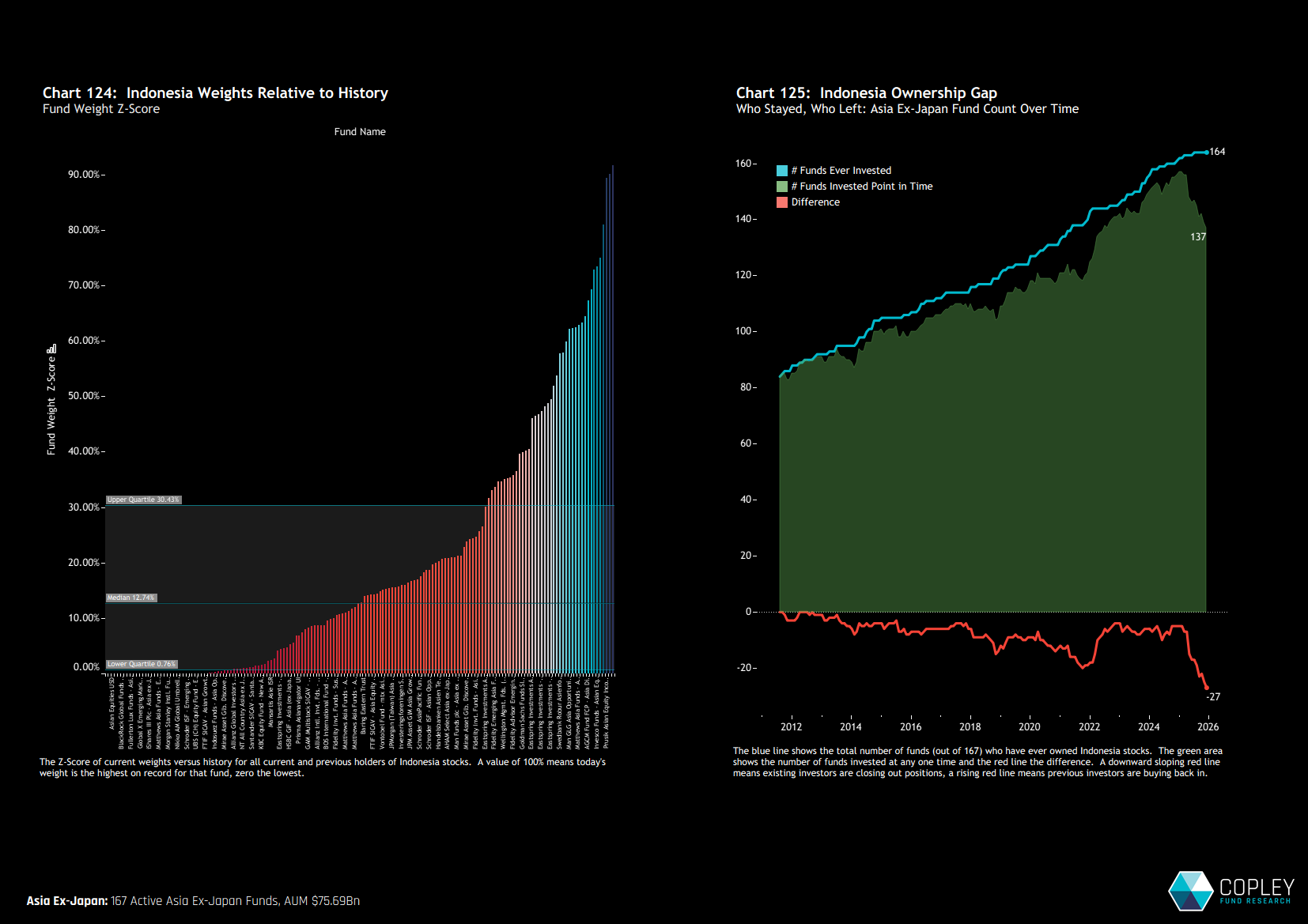 Chart 125 reinforces this picture from a breadth perspective. The blue line tracks the total number of funds (out of 167) that have ever held an Indonesian position, while the green area shows how many are currently invested. The red line—representing the gap between the two—has declined steeply and now sits at a record low. This marks the first time that such a large share of historically active managers have chosen to exclude Indonesia entirely as we head into 2026.