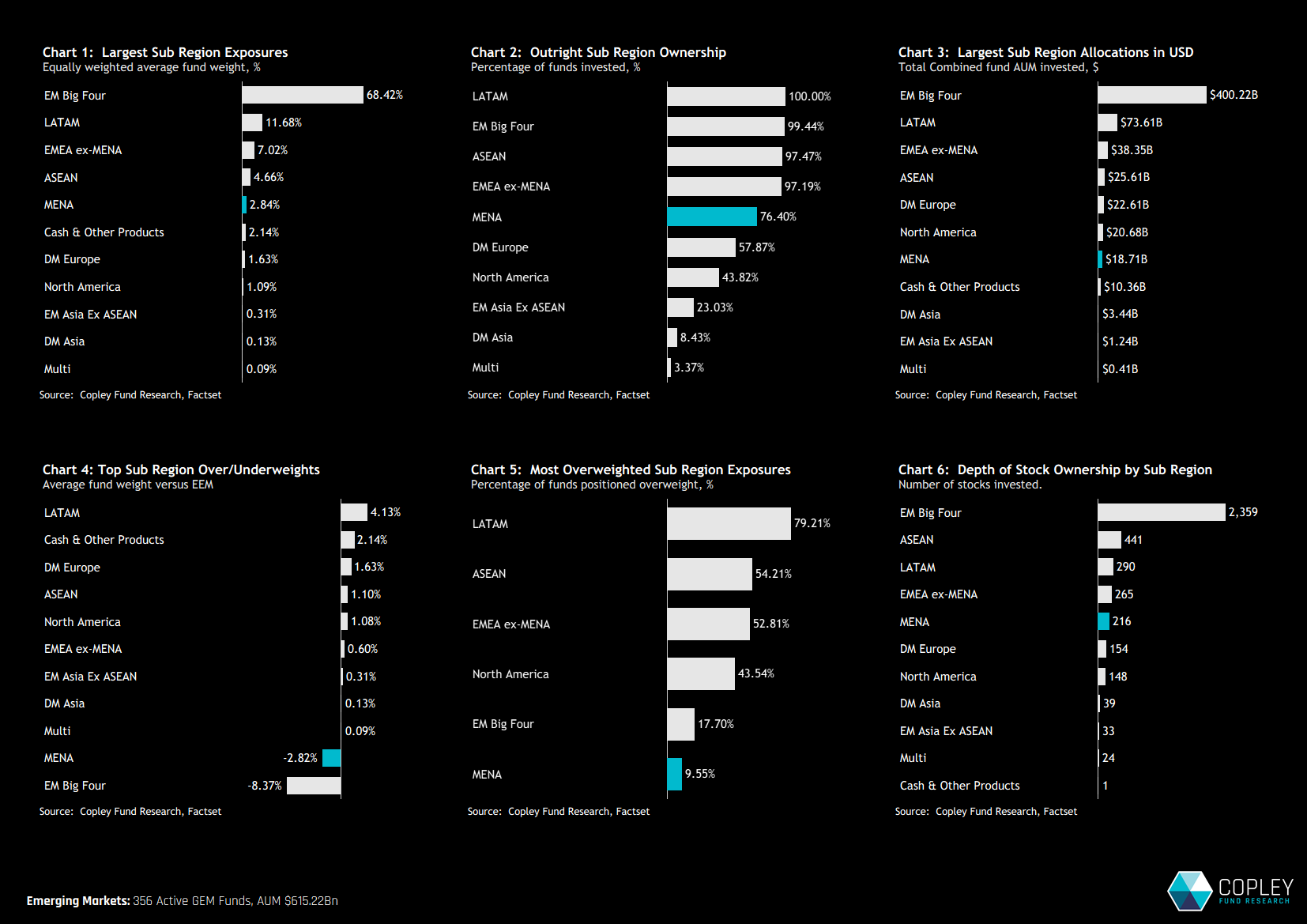 Unlike the structural underweight to the Big Four, the MENA gap is largely driven by non-participation: 23.6% of funds in our analysis hold zero exposure (Chart 2). These zero allocations are a key reason why aggregate MENA positioning remains materially below benchmark.