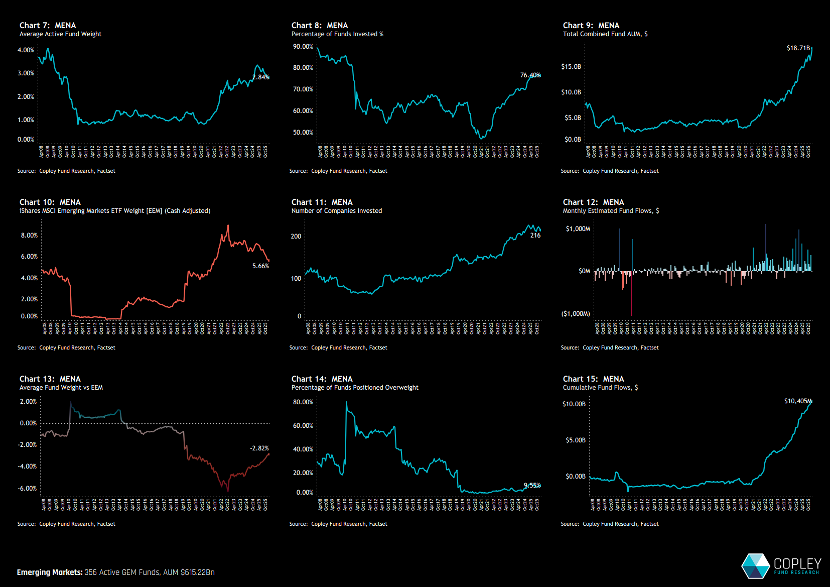The progression of MENA ownership among GEM funds is shown in the charts below. It reflects a steady rise in exposure, particularly following the major index inclusions in 2019. Chart 8 shows the percentage of funds invested in MENA increasing from 47% in early 2021 to 76.4% today, alongside a corresponding rise in average fund weights (Chart 7).