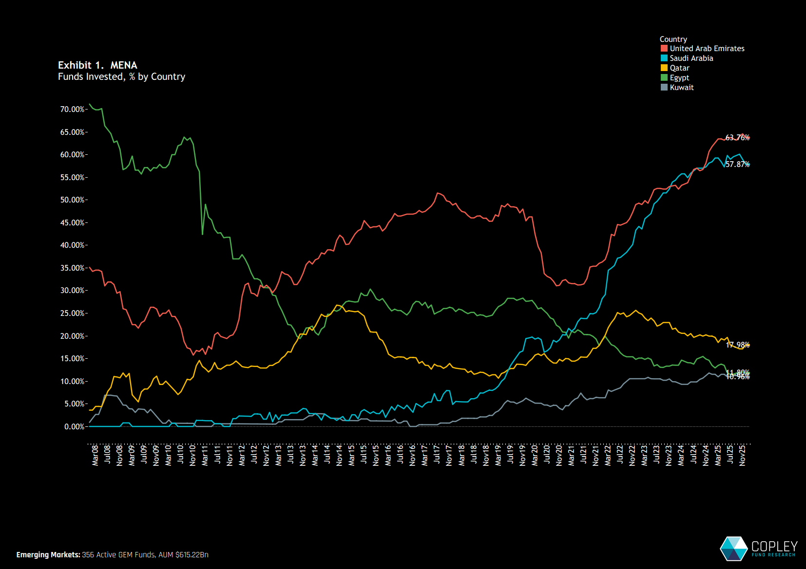 At the country level, MENA investment growth has been driven almost entirely by Saudi Arabia and the United Arab Emirates. Both markets have seen sustained increases in ownership since early 2020, with participation rising broadly in tandem over the subsequent years. While momentum has eased recently, the UAE overtook Saudi Arabia in outright ownership at the end of 2024 and remains ahead today, held by 63.8% of funds versus 57.9% for Saudi.