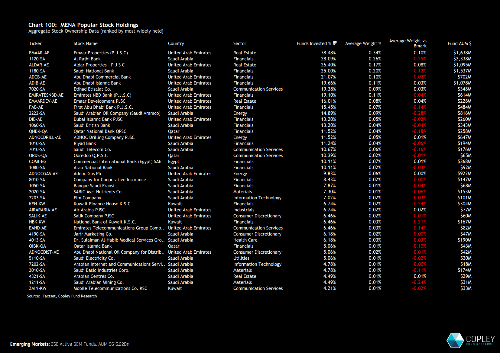 Emaar Properties and Aldar Properties are also the two largest aggregate overweight positions. In contrast, the majority of the MENA universe is held below index weight. The most notable underweights include Saudi Aramco, Al Rajhi Bank and Kuwait Finance House.