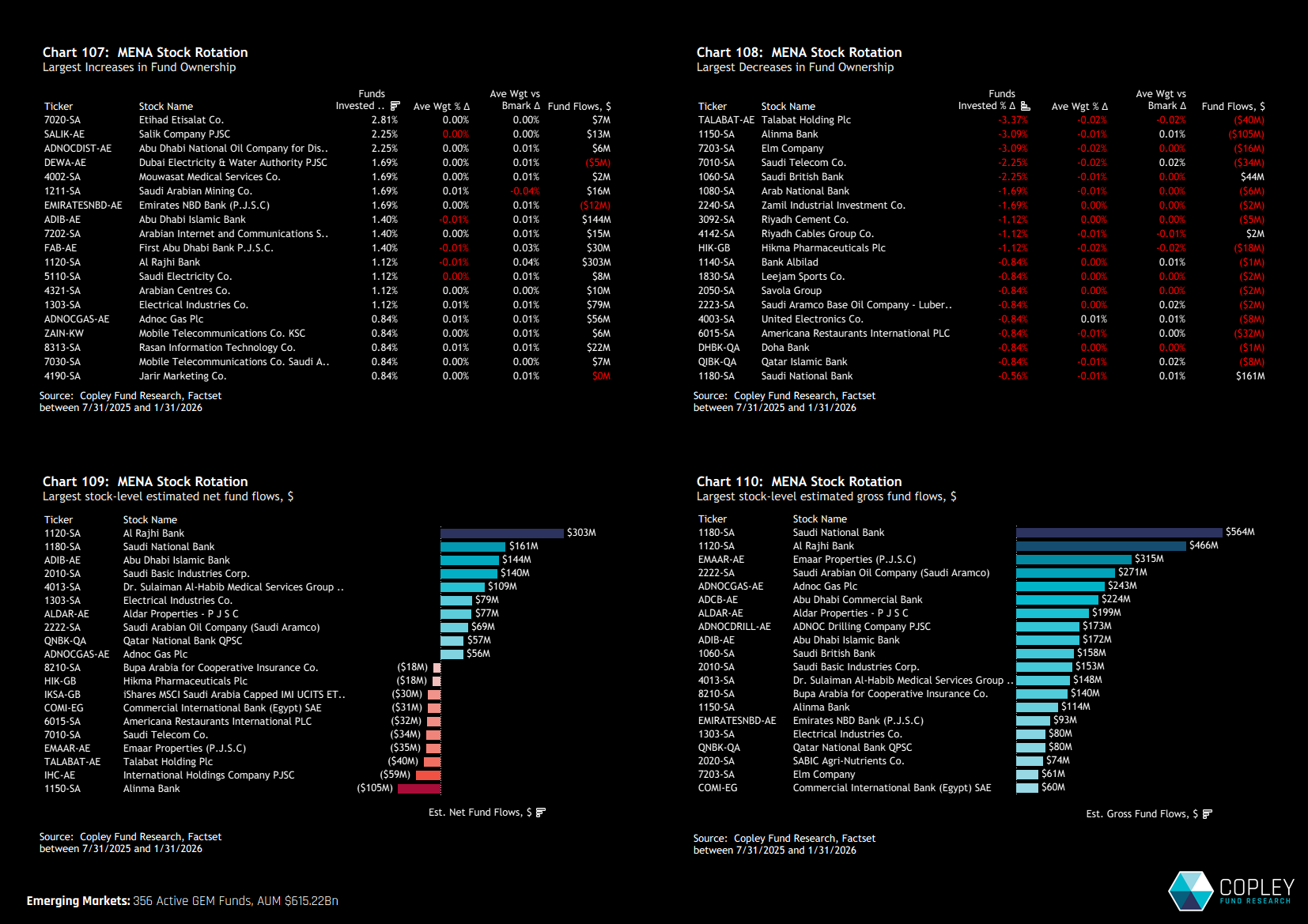 Conversely, Talabat Holding saw net closures from 3.4% of funds in our universe, with 3.1% closing positions in both Elinma Bank and Elm Company. From a flow perspective, the superior liquidity of Al Rajhi Bank and Saudi National Bank is evident in both net and gross fund flow metrics.