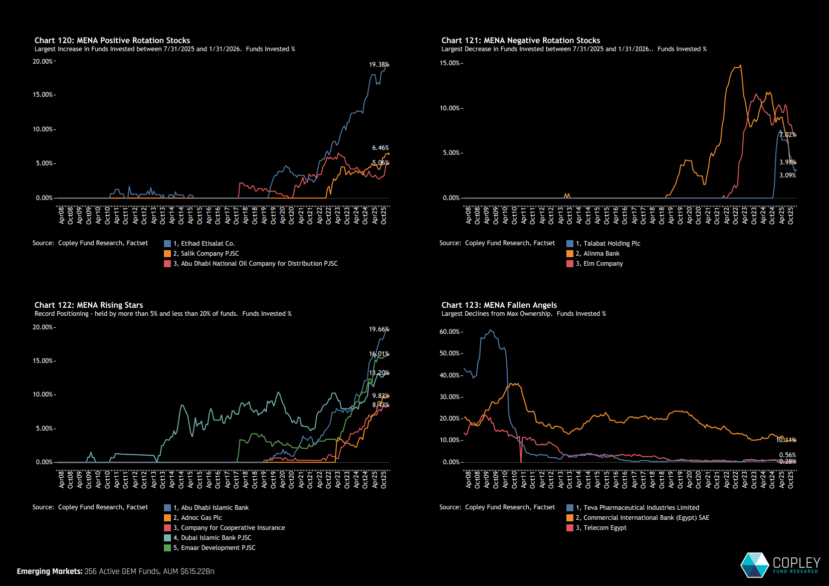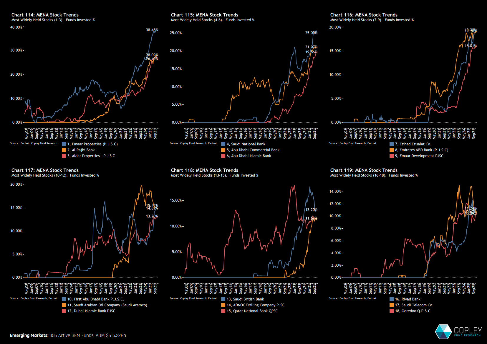 The charts below show the time series of the percentage of funds invested in each of the 18 most widely owned MENA companies. Charts 114–116 illustrate how aggressively ownership has risen in the leading names, all of which are now at record levels of fund participation.