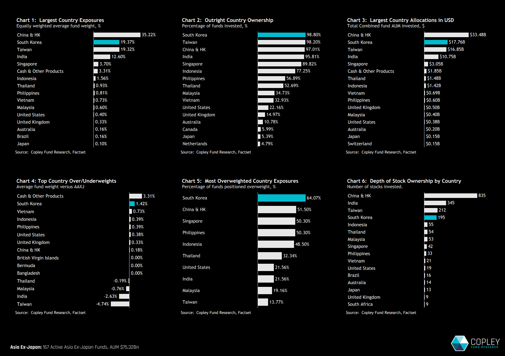 The charts below show current ownership dynamics at the country level for Asia ex-Japan active equity funds. Chart 1 shows the average country weight across managers. South Korea is now the second-largest allocation in the region at 19.37%, marginally ahead of Taiwan (19.32%) and India (12.60%), but still well behind China & HK (35.22%). Together, these four markets dominate active allocations in Asia ex-Japan.