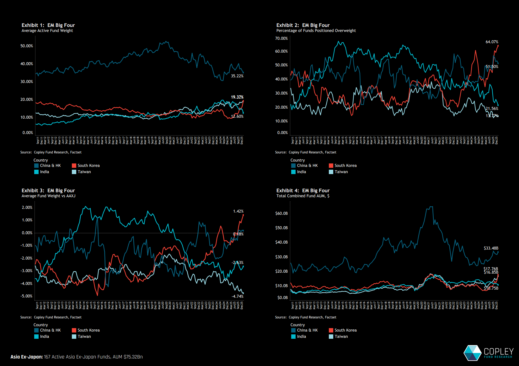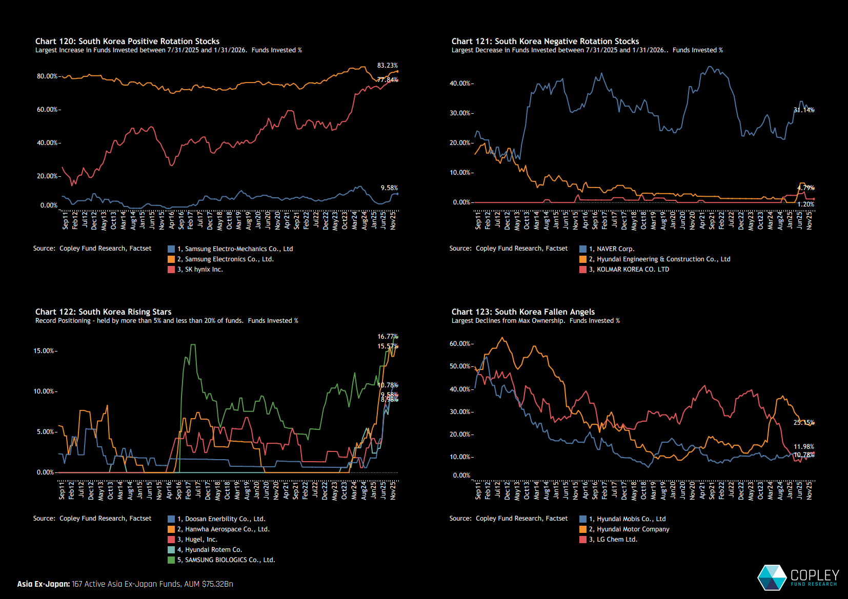Finally, Chart 123 identifies South Korea’s “fallen angels” — stocks that were once core holdings but have seen sustained declines in ownership over the past decade. LG Chem and Hyundai Mobis stand out here, now largely absent from Asia ex-Japan active portfolios.