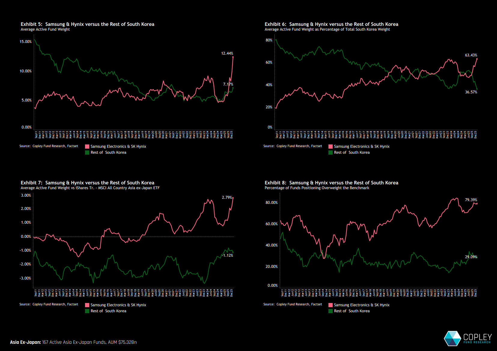 The top two stocks now account for 63.4% of total South Korea exposure — a record high, although comparable to the concentration seen in early 2024 (Exhibit 6). Positioning versus the AC Asia ex-Japan index is even more revealing. Managers hold the top two stocks at an average +2.8% overweight, while the remainder of the country is, on average, -1.12% underweight (Exhibit 7).